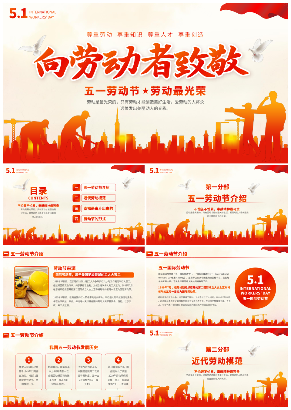 这是一张五一劳动节节日PPT模板,包含五一劳动节、节日等主题内容,也可用作五一劳动节、劳动节节日、五一节日等PPT场景使用。