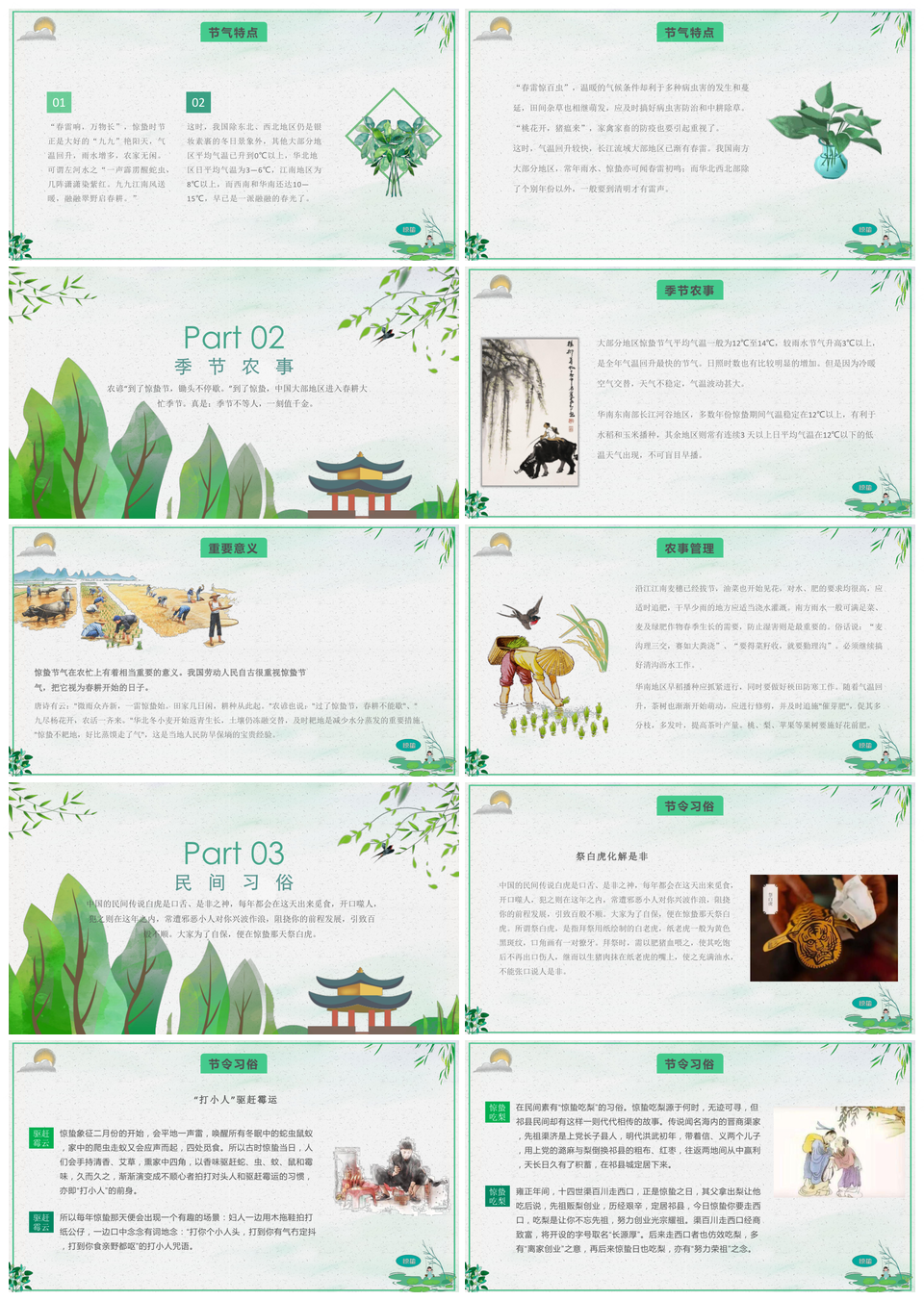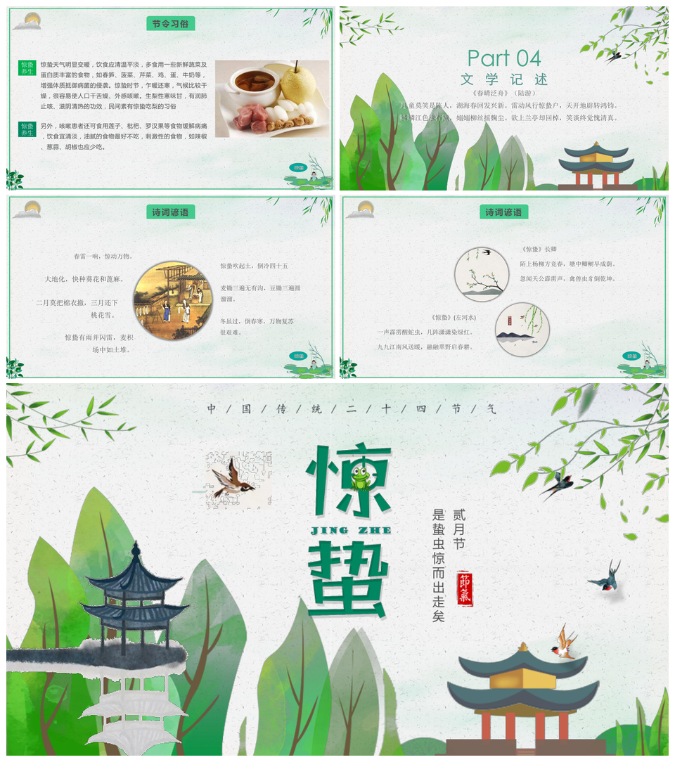 这是一张绿色小清新惊蛰节气习俗介绍PPT模板,包含绿色、小清新、惊蛰、节气、习俗、介绍等主题内容,也可用作惊蛰节气习俗介绍、绿色小清新惊蛰节气、惊蛰节气习俗、绿色小清新惊蛰、惊蛰节气、节气习俗、习俗介绍、绿色小清新、惊蛰习俗、小清新惊蛰等PPT场景使用。