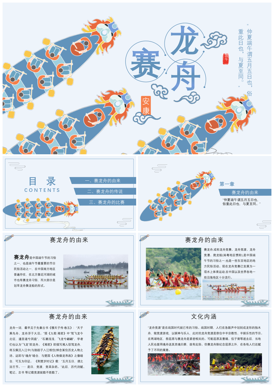 这是一张蓝色简约卡通端午节龙舟文化介绍主题PPT模板,包含蓝色、简约、卡通、端午节、龙舟、文化、介绍、主题等主题内容,也可用作蓝色简约卡通端午节、简约卡通端午节龙舟、卡通端午节龙舟文化、端午节龙舟文化介绍、龙舟文化介绍主题、蓝色简约卡通龙舟、简约卡通龙舟文化、卡通龙舟文化主题、端午节文化介绍主题、蓝色简约文化介绍、简约卡通端午节主题、龙舟介绍主题蓝色、卡通端午节主题简约、蓝色龙舟文化主题、简约端午节文化介绍等PPT场景使用。