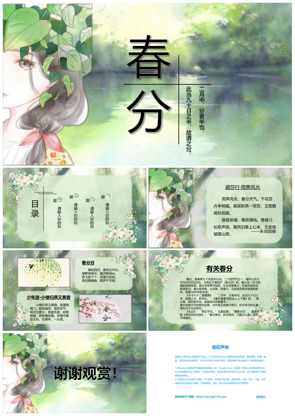 本站提供的节气春分手绘风绿色PPT模板,下载格式为pptx,一共6页,作品中文字及图均可以修改和编辑,图片更改请在作品中右键图片并更换,文字修改请直接点击文字进行修改。