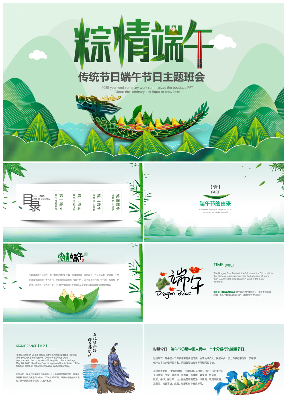 本站提供的2025粽子绿色端午节主题班会PPT模板,下载格式为pptx,一共24页,作品中文字及图均可以修改和编辑,图片更改请在作品中右键图片并更换,文字修改请直接点击文字进行修改。