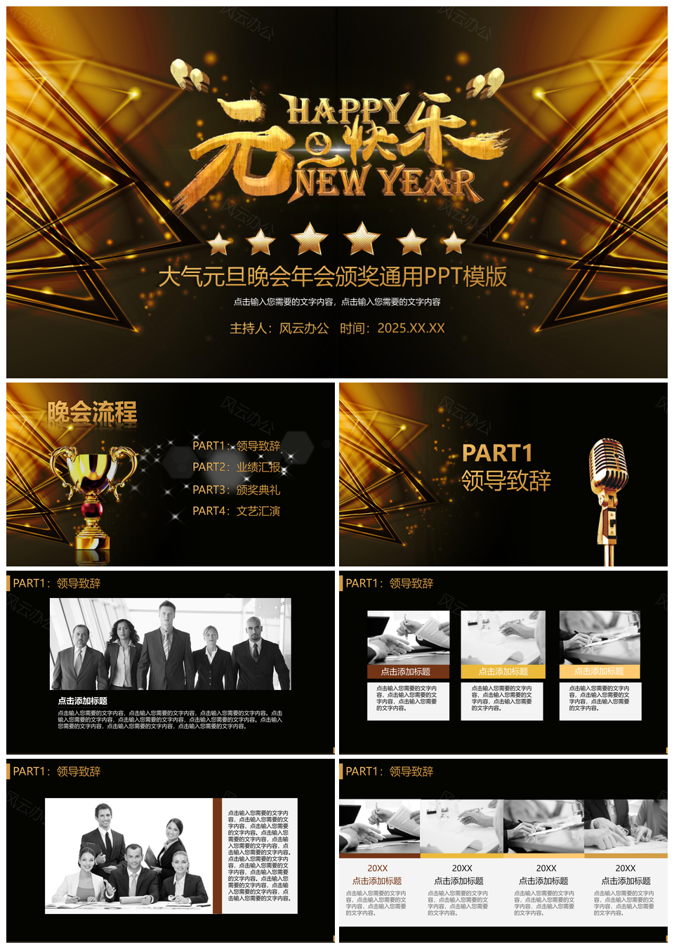 本站提供的2025大气元旦晚会企业年会颁奖通用PPT模板,下载格式为pptx,一共22页,作品中文字及图均可以修改和编辑,图片更改请在作品中右键图片并更换,文字修改请直接点击文字进行修改。