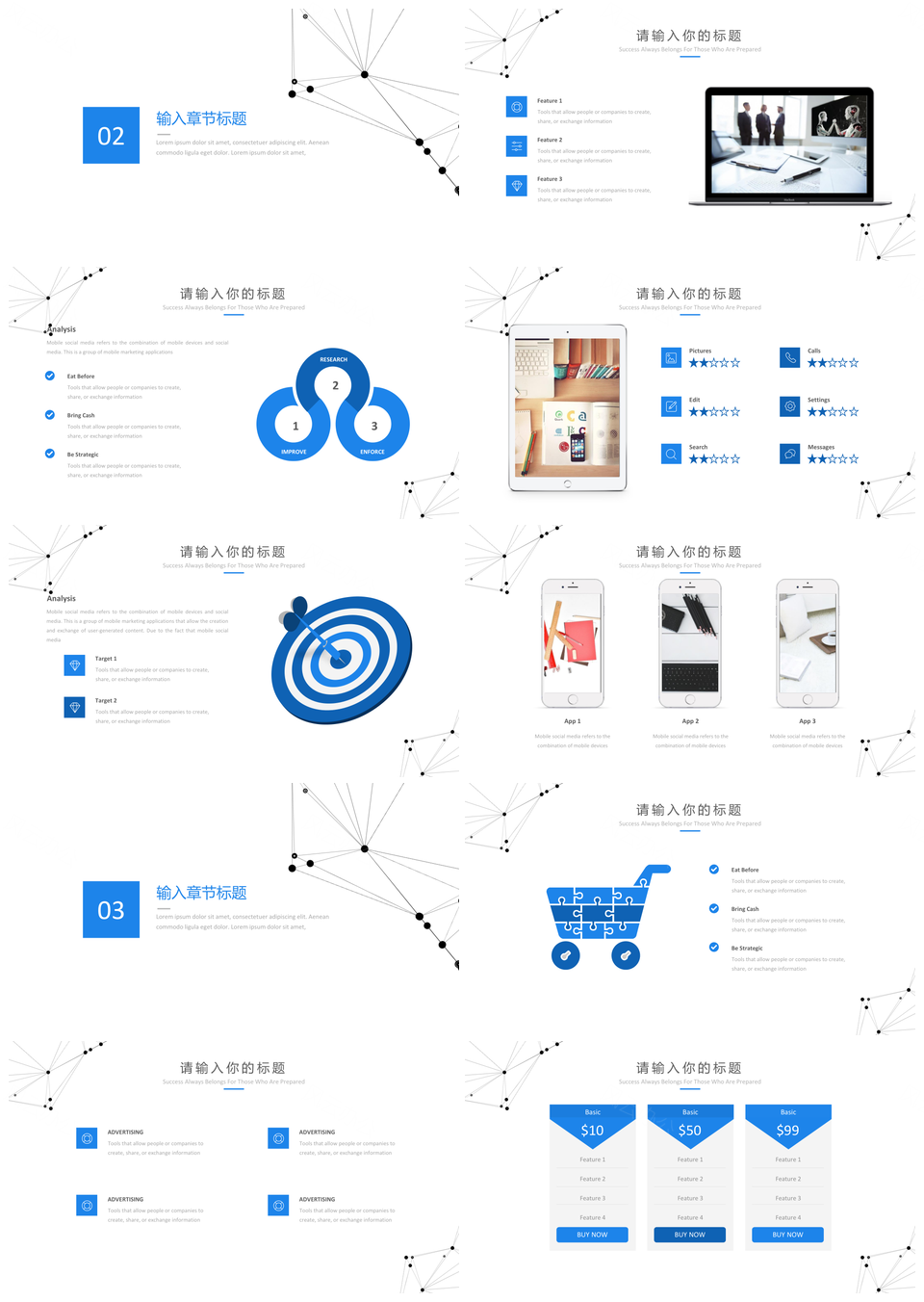本站提供的2025蓝色小清新创意点线简约工作总结PPT模板,下载格式为pptx,一共50页,作品中文字及图均可以修改和编辑,图片更改请在作品中右键图片并更换,文字修改请直接点击文字进行修改。