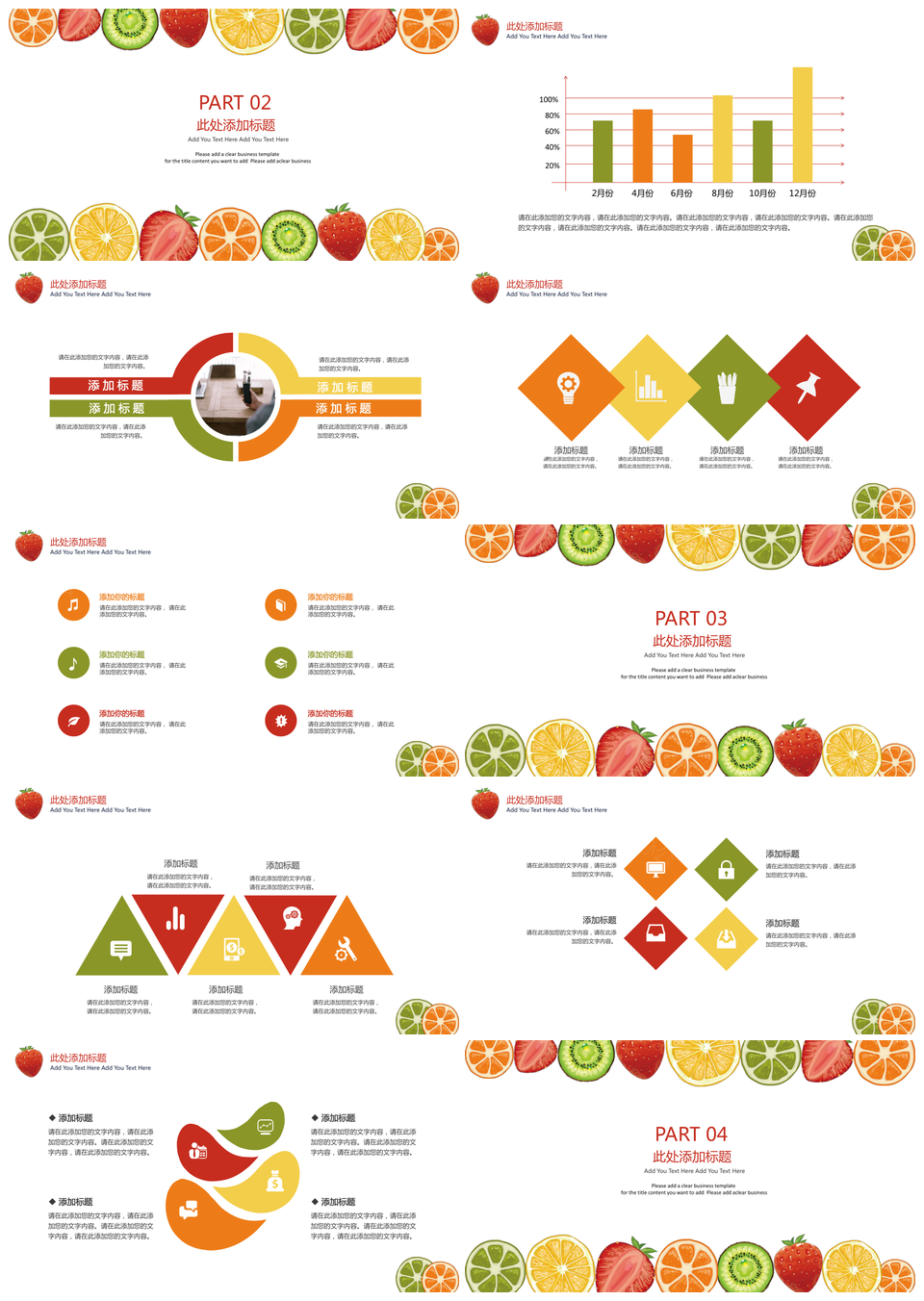 本站提供的彩色炫彩简约水果清晰商务PPT模板,下载格式为pptx,一共20页,作品中文字及图均可以修改和编辑,图片更改请在作品中右键图片并更换,文字修改请直接点击文字进行修改。