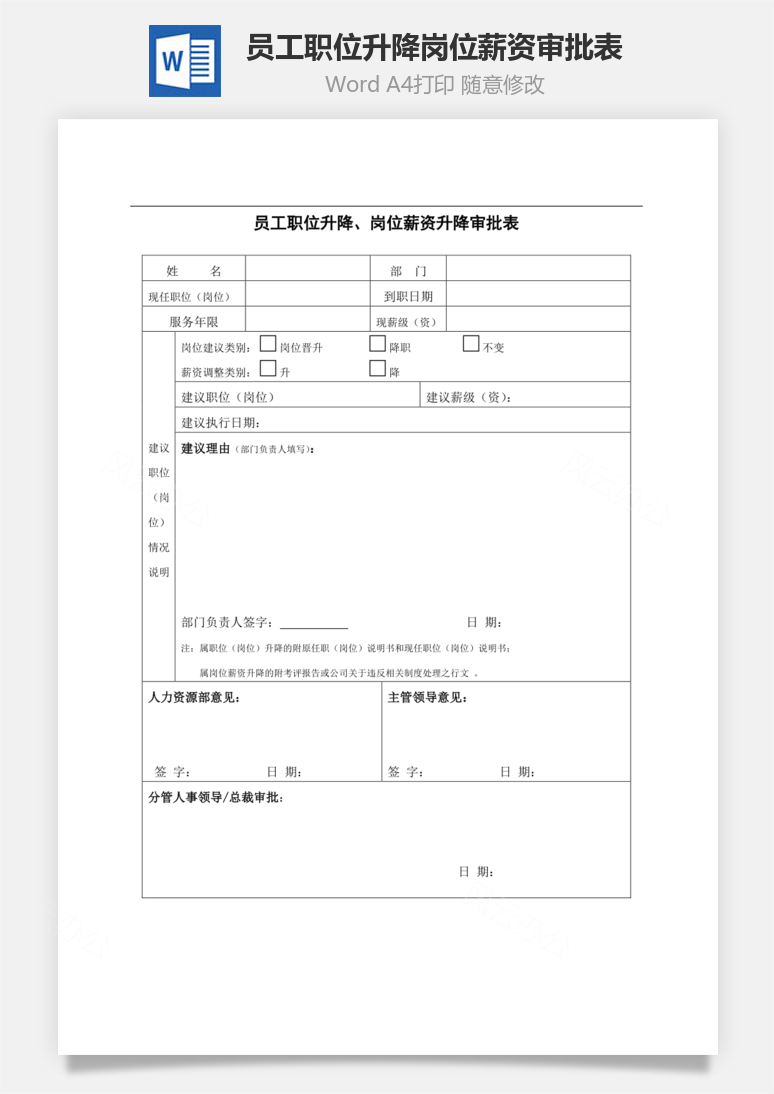 当前位置:首页>Word模板>企业管理>员工职位升降岗位薪资审批表Word模板 员工职位升降岗位薪资审批表Word模板 企业管理 25年5月7日 编辑 前往下载 admin 取消关注 关注 私信 本站提供员工职位升降岗位薪资审批表Word模板下载,格式为 word,一共1页,作品中文字及图均可以修改和编辑,图片更改请在作品中右键图片并更换,文字修改请直接点击文字进行修改。更多精彩人力资源Word模板,尽在本站。 下载权限查看 ¥ 免费下载 评论并刷新后下载 登录后下载 查看演示 {{attr.name}}: 您当前的等级为 登录后免费下载登录 小黑屋反思中,不准下载! 评论后刷新页面下载评论 支付¥以后下载 请先登录 您今天的下载次数(次)用完了,请明天再来 支付积分以后下载立即支付 支付以后下载立即支付 您当前的用户组不允许下载升级会员 您已获得下载权限 您可以每天下载资源次,今日剩余次 相关文章: 员工岗位调整审批表Word模板 员工转正审批Word模板 公司各部门岗位职责Word模板 员工奖惩管理制度Word模板 版权声明 站内部分内容由互联网用户自发贡献,该文观点仅代表作者本人。本站仅提供网络资源分享服务,不拥有所有权,不承担相关法律责任。如发现本站有涉嫌抄袭侵权/违法违规的内容, 请 联系我们 一经核实,立即删除。并对发布账号进行永久封禁处理。在为用户提供最好的产品同时,保证优秀的服务质量。 本站仅提供信息存储空间,不拥有所有权,不承担相关法律责任。 给TA打赏 共{{data.count}}人 人已打赏 升降员工审批岗位职位薪资