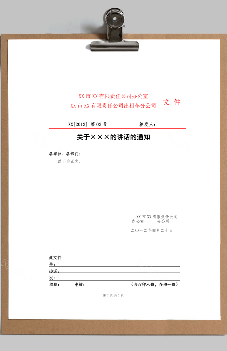 当前位置:首页>Word模板>企业管理>公司内部红头文件Word模板 公司内部红头文件Word模板 企业管理 25年6月11日 编辑 前往下载 admin 取消关注 关注 私信 本站提供公司内部红头文件Word模板下载,格式为 word,一共1页,作品中文字及图均可以修改和编辑,图片更改请在作品中右键图片并更换,文字修改请直接点击文字进行修改。更多精彩人力资源Word模板,尽在本站。 下载权限查看 ¥ 免费下载 评论并刷新后下载 登录后下载 查看演示 {{attr.name}}: 您当前的等级为 登录后免费下载登录 小黑屋反思中,不准下载! 评论后刷新页面下载评论 支付¥以后下载 请先登录 您今天的下载次数(次)用完了,请明天再来 支付积分以后下载立即支付 支付以后下载立即支付 您当前的用户组不允许下载升级会员 您已获得下载权限 您可以每天下载资源次,今日剩余次 相关文章: 公司培训方案Word模板 公司节日活动策划方案Word模板 公司管理制度Word模板 公司岗位职责大全Word模板 版权声明 站内部分内容由互联网用户自发贡献,该文观点仅代表作者本人。本站仅提供网络资源分享服务,不拥有所有权,不承担相关法律责任。如发现本站有涉嫌抄袭侵权/违法违规的内容, 请 联系我们 一经核实,立即删除。并对发布账号进行永久封禁处理。在为用户提供最好的产品同时,保证优秀的服务质量。 本站仅提供信息存储空间,不拥有所有权,不承担相关法律责任。 给TA打赏 共{{data.count}}人 人已打赏 公司内部红头文件