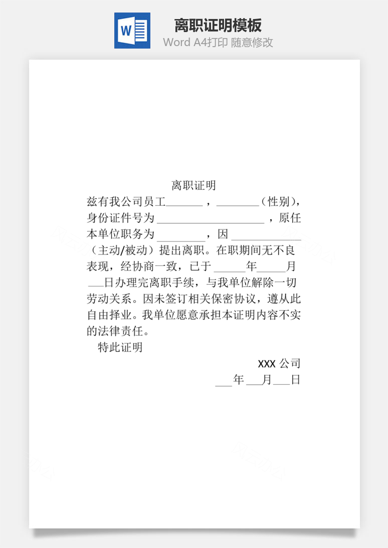当前位置:首页>Word模板>企业管理>离职申请离职证明Word模板 离职申请离职证明Word模板 企业管理 25年6月12日 编辑 前往下载 admin 取消关注 关注 私信 本站提供离职申请离职证明Word模板下载,格式为 word,一共1页,作品中文字及图均可以修改和编辑,图片更改请在作品中右键图片并更换,文字修改请直接点击文字进行修改。更多精彩人力资源Word模板,尽在本站。 下载权限查看 ¥ 免费下载 评论并刷新后下载 登录后下载 查看演示 {{attr.name}}: 您当前的等级为 登录后免费下载登录 小黑屋反思中,不准下载! 评论后刷新页面下载评论 支付¥以后下载 请先登录 您今天的下载次数(次)用完了,请明天再来 支付积分以后下载立即支付 支付以后下载立即支付 您当前的用户组不允许下载升级会员 您已获得下载权限 您可以每天下载资源次,今日剩余次 相关文章: 会议签到表Word模板 中小企业管理员工考核表Word模板 拓展活动方案Word模板 会议登记簿Word模板 版权声明 站内部分内容由互联网用户自发贡献,该文观点仅代表作者本人。本站仅提供网络资源分享服务,不拥有所有权,不承担相关法律责任。如发现本站有涉嫌抄袭侵权/违法违规的内容, 请 联系我们 一经核实,立即删除。并对发布账号进行永久封禁处理。在为用户提供最好的产品同时,保证优秀的服务质量。 本站仅提供信息存储空间,不拥有所有权,不承担相关法律责任。 给TA打赏 共{{data.count}}人 人已打赏 离职申请离职证明
