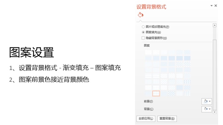 设置背景格式,选择图案填充;系统提供了多种图案供选择,注意图案的前景色与背景色设置相近。