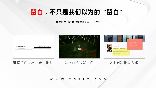 以上就是Jobor小钵为大家分享的如何在PPT制作中,更好地使用留白原则,从而获得更好的PPT设计效果。这里也留个问题给大家思考:留白区域越大越好吗?欢迎大家留言交流。更多PPT制作教程,请关注Jobor小钵。