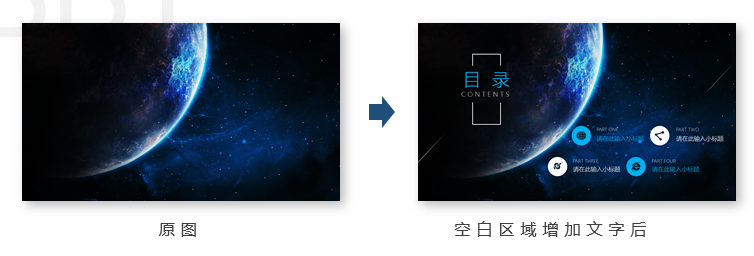 - 由于设计师已经考虑到留白原则,我们搜索的图片往往已经预留了空白区域,但在PPT设计中我们不仅限于图片带来的空白区域,我们也可以自己通过摆放内容位置或者通过形状等改造图片实现。