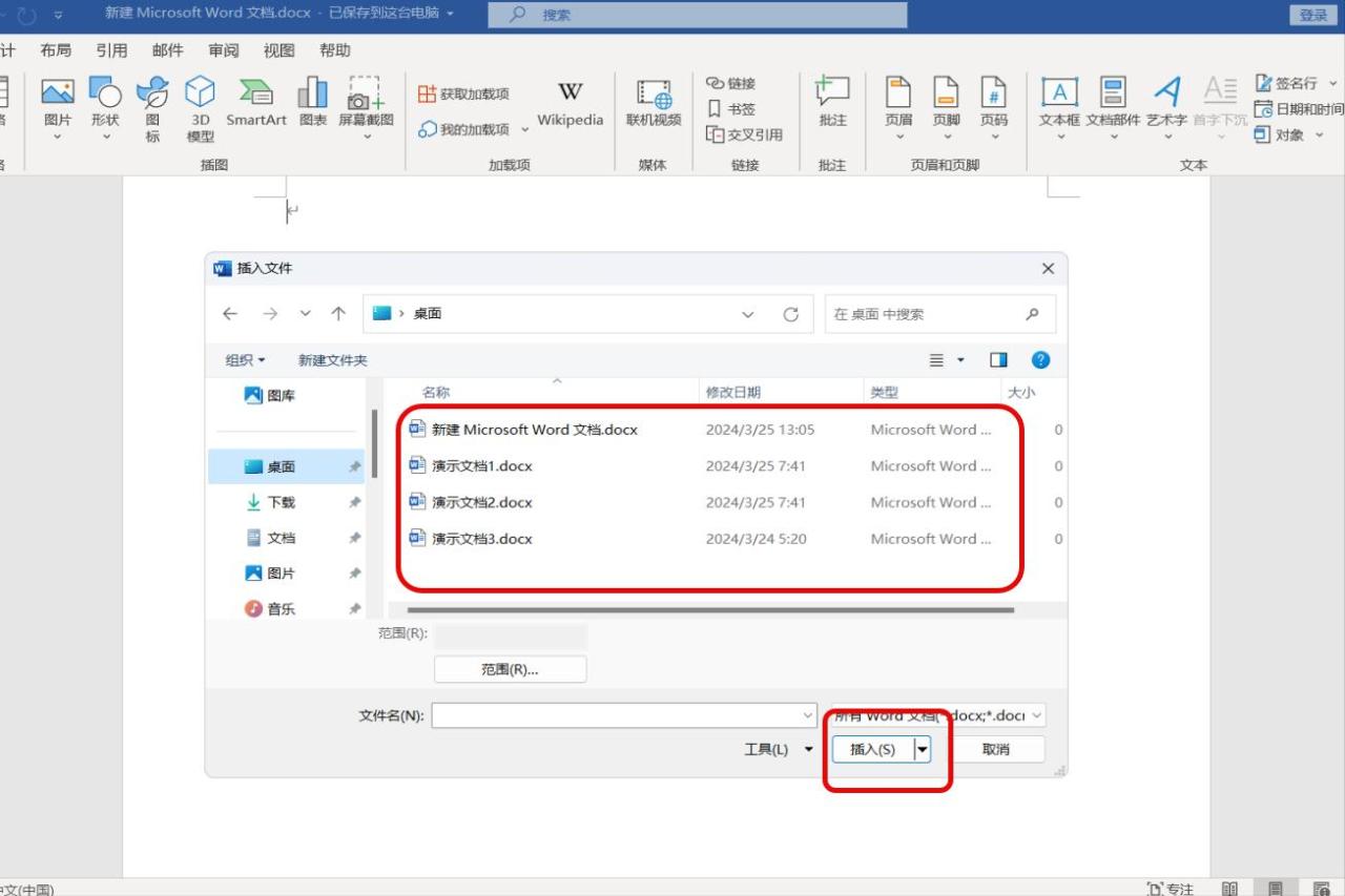 4、选择并插入需合并的文档:此时会弹出“插入文件”的对话框,在这个对话框里,找到存放需要合并文档的文件夹。如果要合并的文档是相邻排列的,按住“Shift”键不放,然后依次点击第一个和最后一个文档,就能一次性选中它们;要是文档不相邻,那就按住“Ctrl”键,逐个点击需要合并的文档。选好所有文档后,点击“插入”按钮。瞬间,3个文档的内容就完美合并到一个文档里啦!