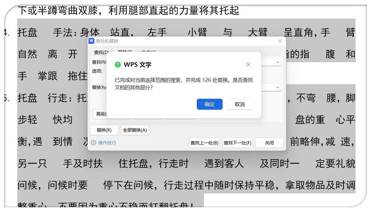 5、执行替换操作:一切设置就绪,点击 “全部替换” 按钮,选中的文字里的空格就会消失得无影无踪。不过,这里有个超级重要的小细节要注意!当点击 “全部替换” 后,会弹出一个提示框,显示 “已完成对当前选择范围的所有……。是否查找文档的其他部分?” ,这个时候,千万千万要看清楚,一定要点击 “取消” ,而不是 “确定”!一旦点击 “确定”,整个文档的空格都会被删除,要是有些空格是你需要保留的,那就麻烦大啦!