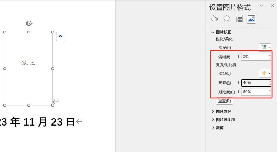 2、校正图片背景:若签名图片背景颜色较暗,影响整体效果,可在 “图片格式” 选项中找到 “校正” 功能。从预设的校正方案中选择合适的选项,优化图片背景。若预设方案无法满足需求,还可手动调整亮度、对比度等参数,实现更理想的效果。