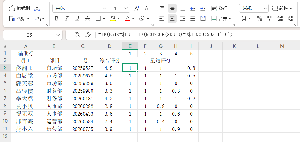 - 若评分数据向上舍入后(ROUNDUP(D3,0))等于辅助列数值,显示评分的小数部分(MOD(D3,1));