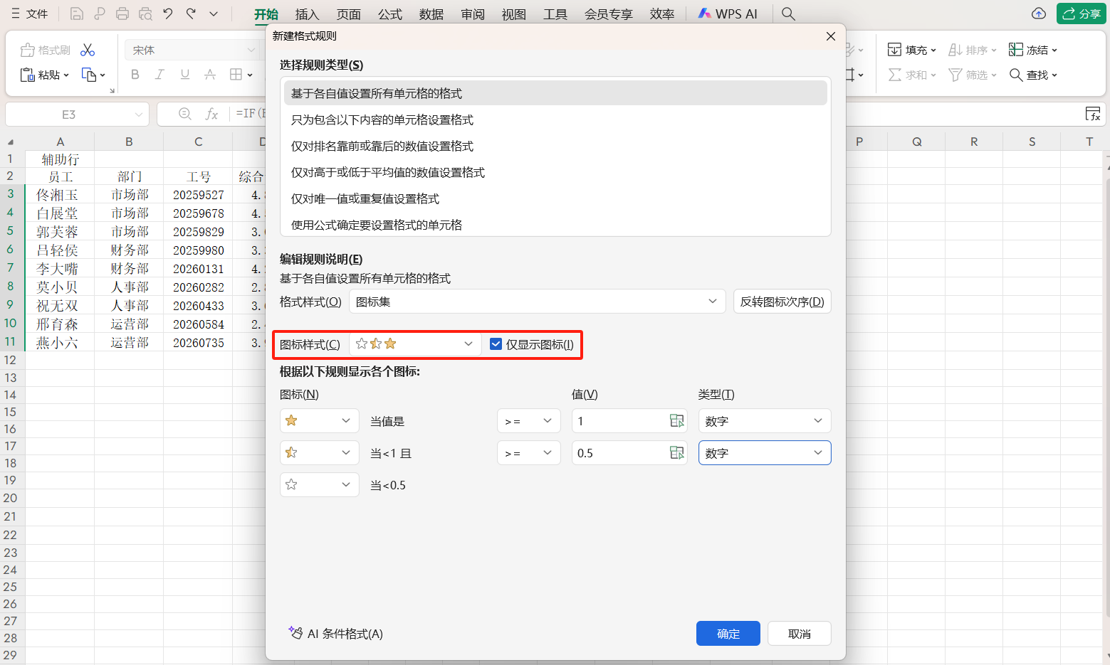 - 在弹出的窗口中,将「图标样式」选择为五角星;勾选「仅显示图标」;「数值类型」设为「数字」,并分别输入“1”和“0.5”作为判断数值。