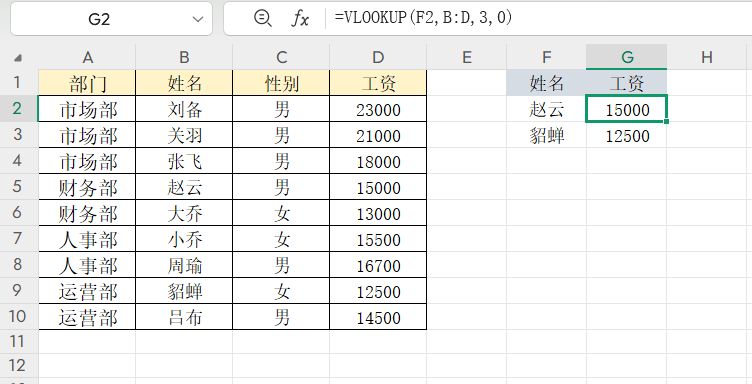 当要查找“吕布”的工资时,筛选结果为D列,筛选条件是B列中等于F2单元格的值,对应的公式就是“=FILTER(D:D,B:B=F2)”,简洁明了。