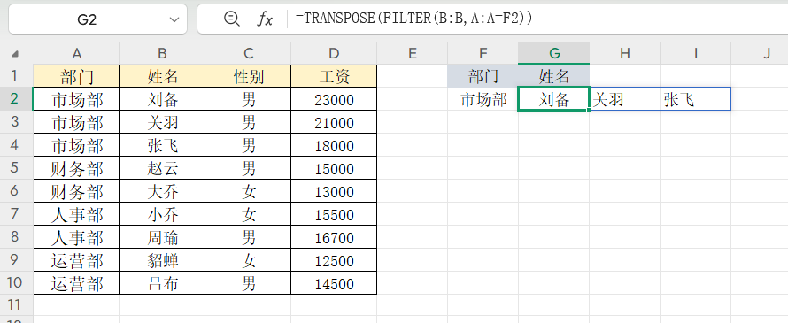 如果想将这些结果横向排列,只需加上转置公式“=TRANSPOSE(FILTER(B:B,A:A=F2))”。而且,若要一次性查找所有部门情况,向下填充公式即可。