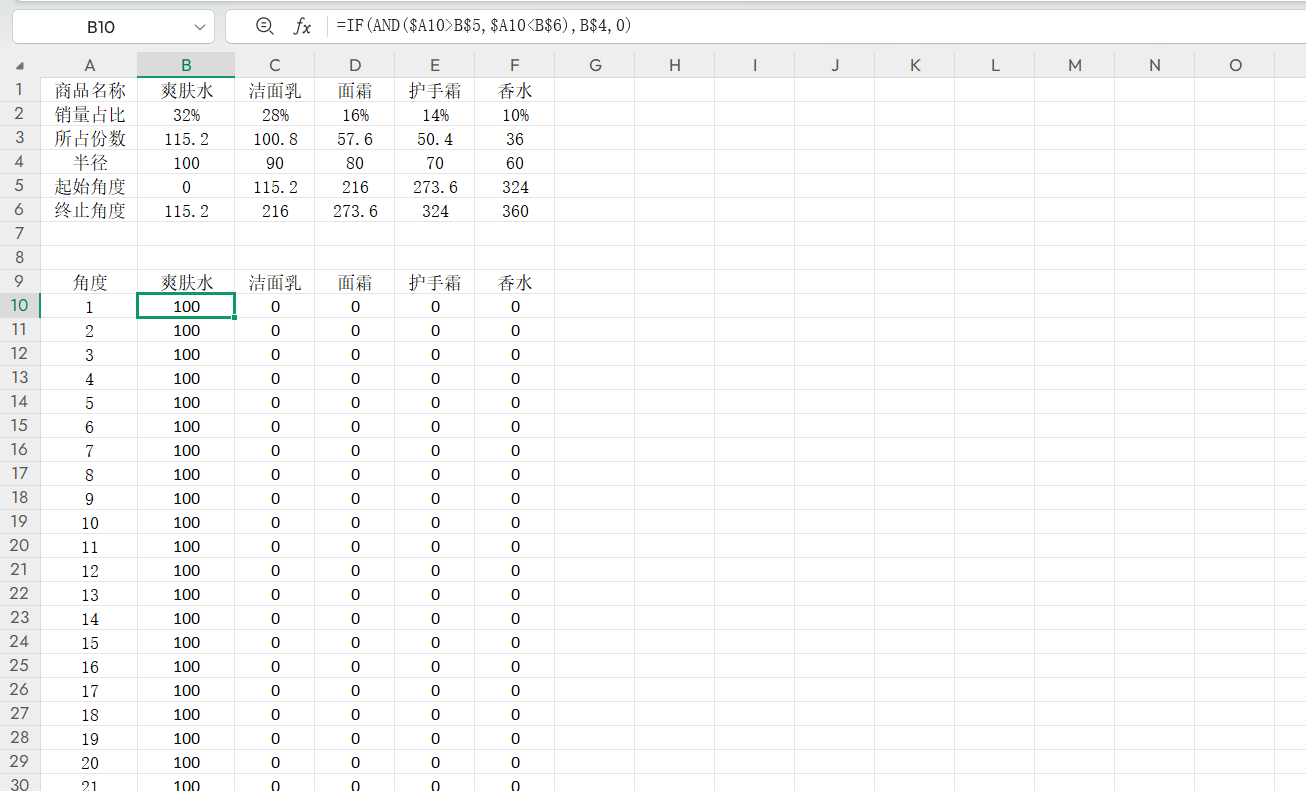 2.接着添加“半径”行,第一个单元格输入100,之后依次按10递减,这些数值可根据实际需求灵活调整。