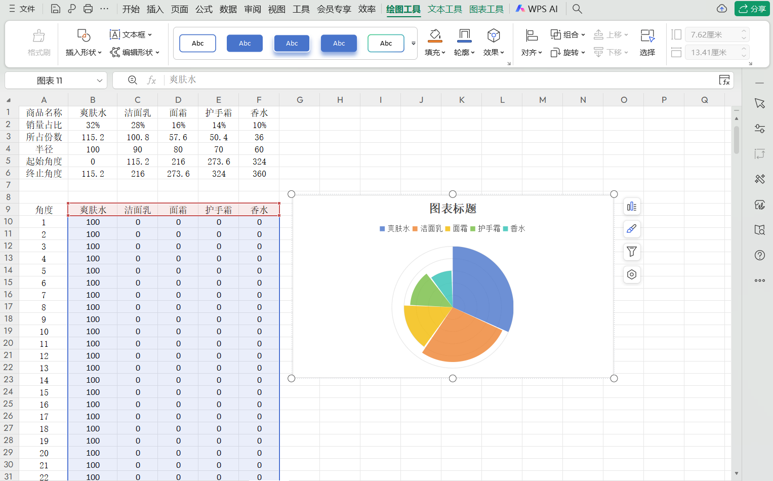 选中辅助表的全部数据区域(注意不用选择角度),点击“插入”菜单,在“所有图表”中找到并插入雷达图,这里不选饼图。插入后,删除图表中的数字标签和数字轴,南丁格尔玫瑰图的基本轮廓就呈现出来了。