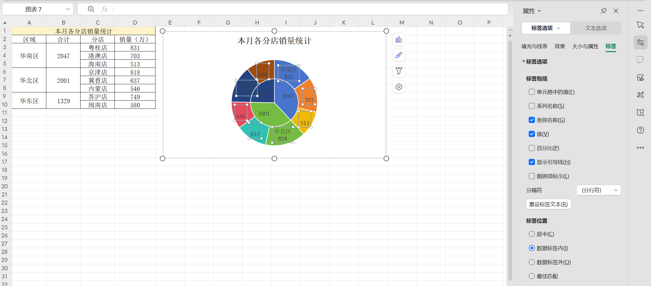 为了更清晰地区分区域与分店数据的层级,需调整饼图的分离度。点击区域饼图,将其整体分离度设置为80%;再双击单个饼块,依次将每个饼块的分离度设置为0%,使图表既层次分明又不显得杂乱。之后,在图表元素中添加数据标签,勾选“标签选项”中的“类别名称”,并将分隔符设置为“分行符”,让数据标签的展示更清晰易读。