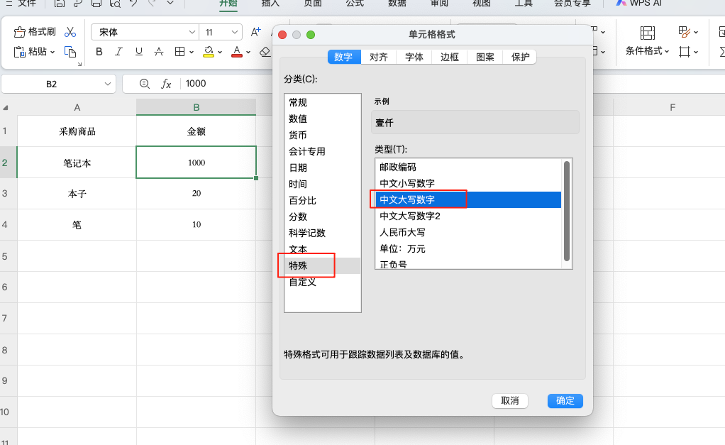 2、在“数字”选项卡中点击【特殊】,找到“中文大写数字”;