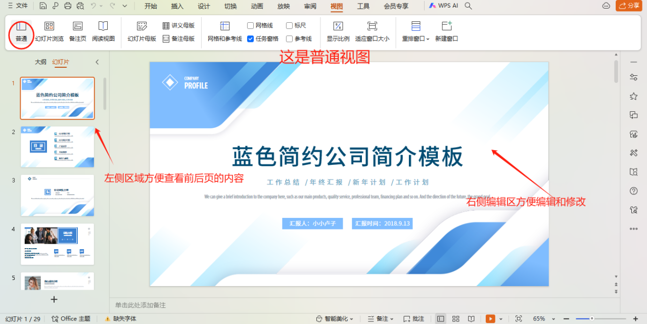 正常ppt打开时默认的就是普通视图,左侧大纲区,右侧编辑区。