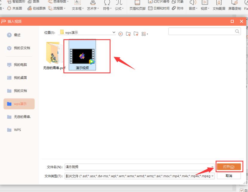随后,在弹出的插入视频窗口中,选定需要插入的视频,再按下【打开】按钮予以确认。