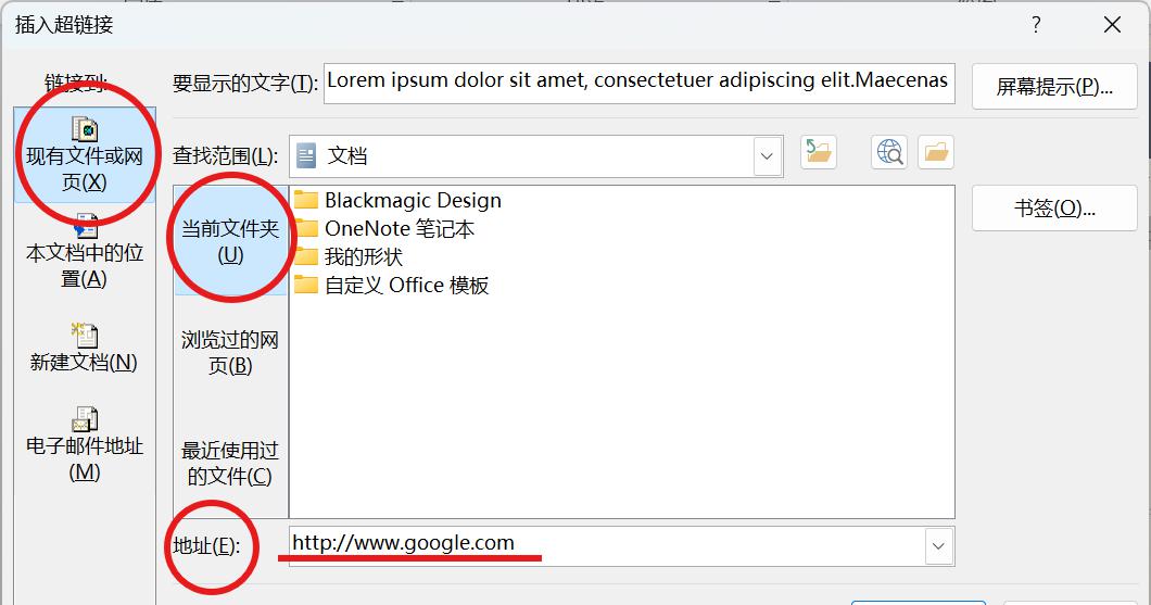 - 单击 “现有文件或网页”:虽然是跳转到网页地址,但这个选项也适用于输入网页链接。