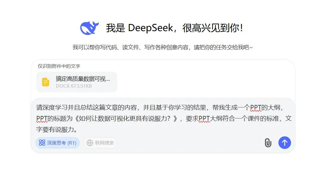 1、使用 DeepSeek 生成 PPT 大纲:首先,打开 DeepSeek 官网,开启与它的智能对话。在这里,我们向 DeepSeek 提出需求,让它为我们生成一个关于数据可视化内容的简要 PPT 大纲,标题设定为《如何让数据可视化更具有说服力?》,并且要求大纲符合课件标准,文字富有说服力。DeepSeek 迅速响应,凭借其强大的算法和智能分析能力,快速生成一份高质量的 PPT 大纲。完成后,我们只需轻松复制这份大纲,为下一步操作做好准备。