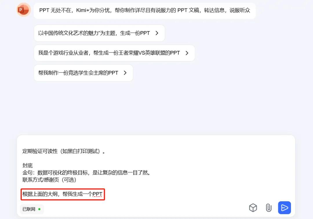 接下来,让我们一起通过实际操作,见证 DeepSeek Kimi 组合的强大威力,看看如何快速制作一份以《如何让数据可视化更具有说服力?》为题的专业课件 PPT。